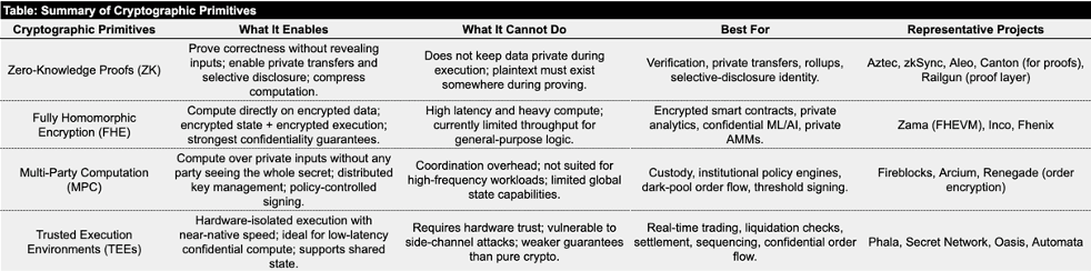 Advances in cryptography primitives like ZK, FHE, MPC, & TEEs have shifted privacy from simply hiding data (Tornado, Monero, etc.) to enabling encrypted computation with selective disclosure (Aztec, Aleo, Zama, etc.). This unlocks several categories of applications that could not exist on transparent blockchains.