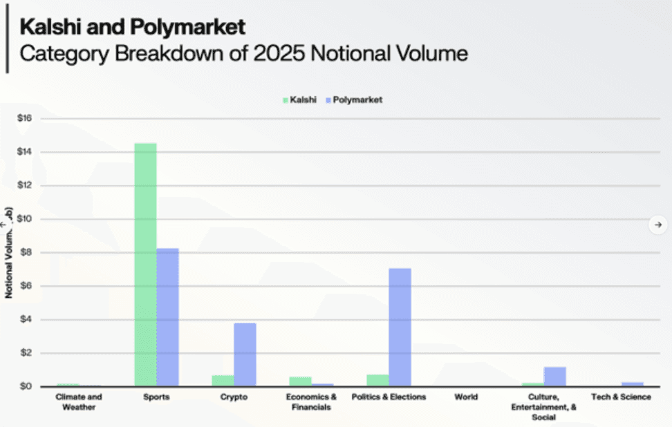 This evolution has been driven primarily by two platforms: Polymarket and Kalshi. Polymarket scaled first by leveraging decentralized, crypto-native infrastructure that bypassed regulatory friction. Built on Polygon and settled in USDC, it prioritized low fees, fast settlement, and global access. This allowed it to dominate early liquidity, processing roughly $14 billion in volume in 2024—largely driven by the U.S. election—and approximately $27 billion in 2025. Its volume is broadly distributed, with Sports, Crypto, and Politics each accounting for roughly 30-35% of activity. Kalshi followed the opposite path. As a CFTC-regulated Designated Contract Market, it grew more slowly initially (about $2 billion in volume in 2024) but benefited from regulatory clarity and access to traditional U.S. distribution. In 2025, integrations with brokers (SIG), fintech platforms (Robinhood), sports organizations (NHL), and major media (CNN)—accelerated adoption. Kalshi’s volume grew to approximately $23.8 billion (>10× YoY), though activity remains heavily concentrated in U.S. sports, which accounts for roughly 90% of volume, reflecting its access to the large domestic sports betting market.