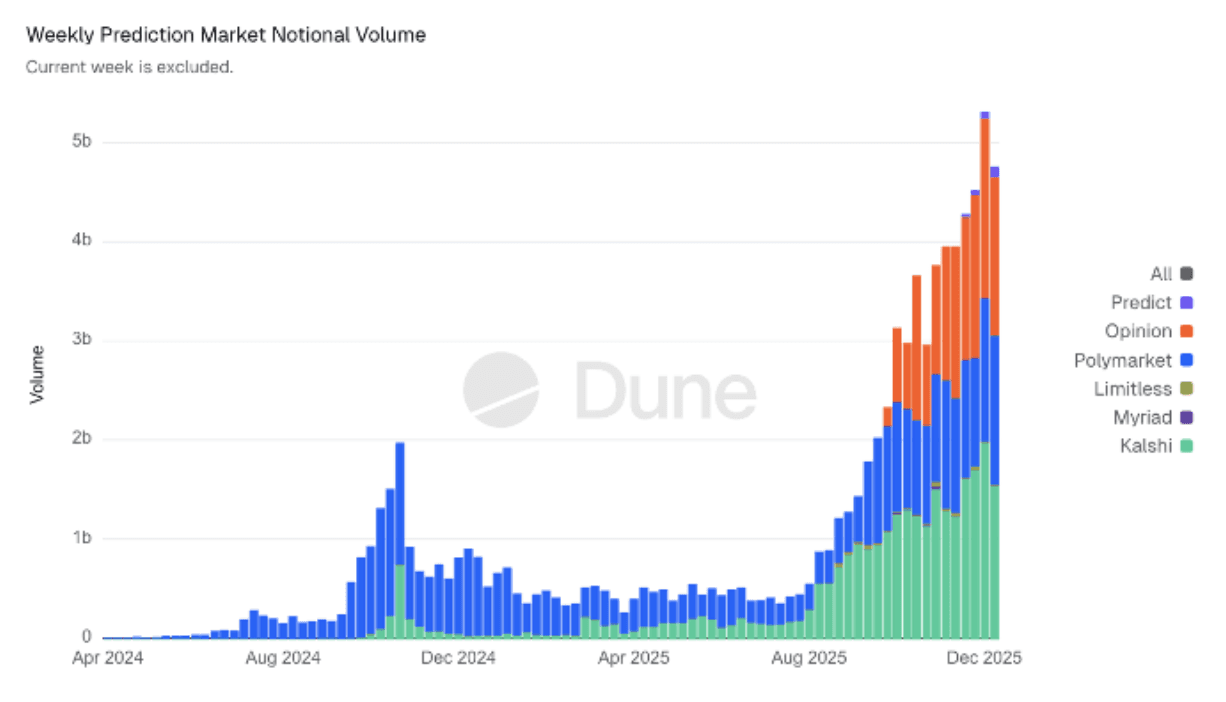 The idea was right; the timing and infrastructure were not. Polymarket rebuilt the model on faster, cheaper rails with stablecoin collateral, instant settlement, and simple interfaces. The 2024 U.S. election attracted liquidity and demonstrated what a high-functioning prediction market could look like at scale. But the real inflection came in 2025, when prediction markets expanded beyond election trading into a broader financial and information product. Weekly volumes surpassed $5 billion at peak, markets diversified into economics, technology, culture, and sports, and regulatory clarity began to emerge—most notably following Kalshi’s legal victory over the CFTC in May 2025.