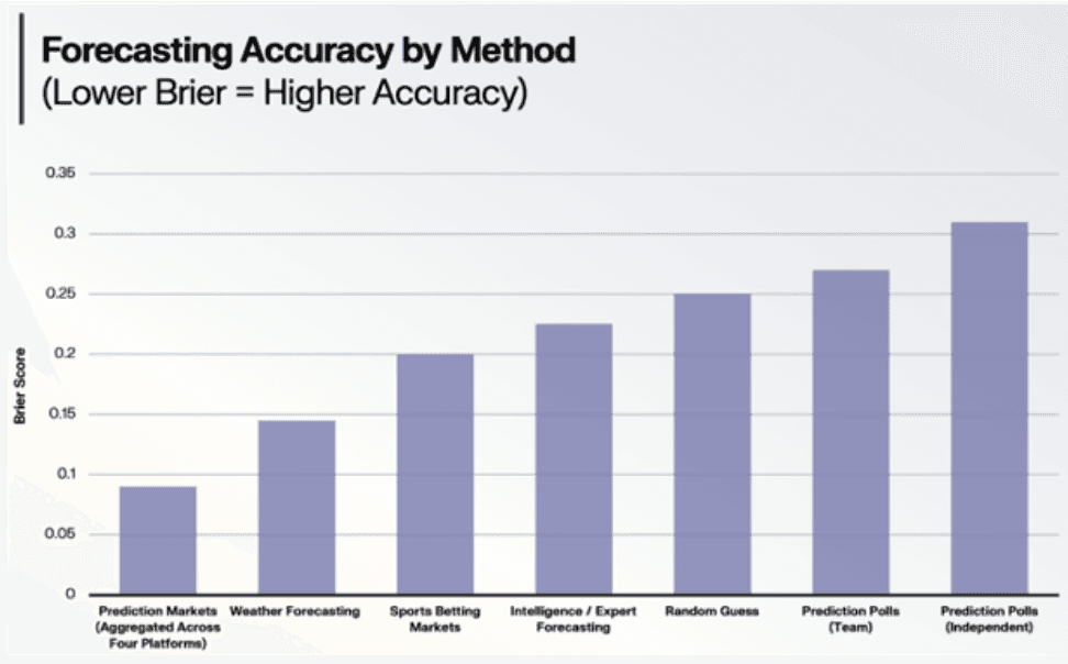 At their core, prediction markets are simple. A user buys a contract that pays $1 if an event occurs and $0 if it does not. The contract price reflects the market-implied probability. A $0.65 price implies a 65% likelihood. Participants who believe the probability is mispriced trade accordingly, earning profits if correct and losing capital if wrong. Despite their simplicity, prediction markets are among the most accurate forecasting systems available. Decades of academic research—from the Iowa Electronic Markets to modern platforms—show that they consistently outperform polls and expert forecasts. Measured by Brier scores, well-functioning prediction markets routinely score around ~0.09, beating traditional polling, expert consensus, and even many weather models.